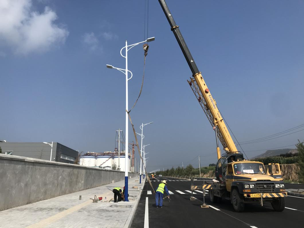 2022-08-11為了使平?jīng)龉I(yè)園區(qū)北大路(汽修路-泓源東路段)照明工程按期交付使用,宜浩園林公司增加施工人員,加大施工設(shè)備投入,不懼連日高溫天氣,加班加點的進行基礎(chǔ)澆筑、燈頭安裝及路燈吊裝等工作,力爭早日完成安裝,達到運行條件。項目由宜浩園林公司負(fù)責(zé)實施,道路全長2