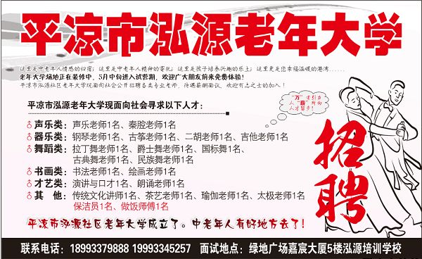 2018-03-27“一年之計(jì)在于春”,在這個(gè)陽(yáng)光明媚,桃花盛開的季節(jié)里,經(jīng)過(guò)培訓(xùn)學(xué)校全體工作人員不懈努力,由平?jīng)龉I(yè)園區(qū)泓源職業(yè)培訓(xùn)學(xué)校出資設(shè)立的平?jīng)鍪秀蠢夏攴?wù)中心(社區(qū)老年大學(xué))終于成立了!目前平?jīng)鍪秀蠢夏攴?wù)中心(社區(qū)老年大學(xué))已經(jīng)取得相關(guān)資質(zhì)證件,正在進(jìn)行